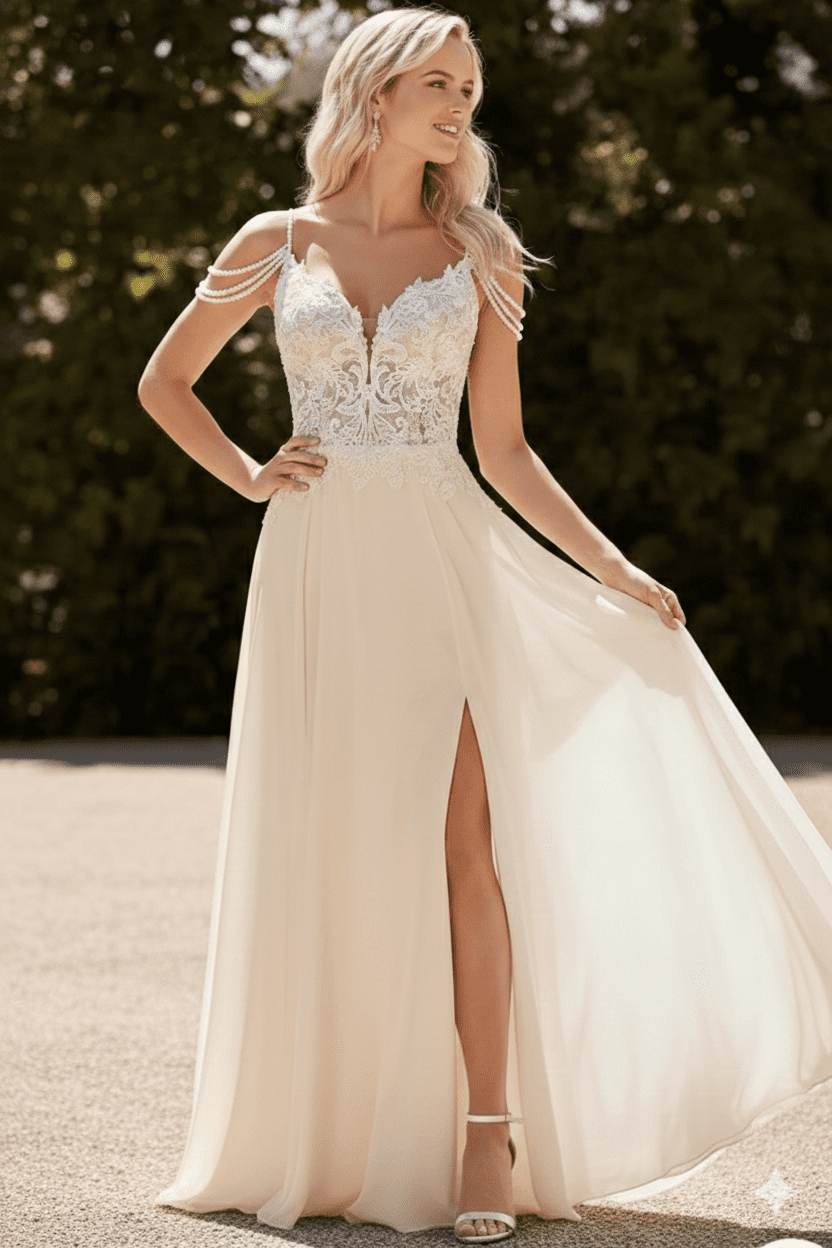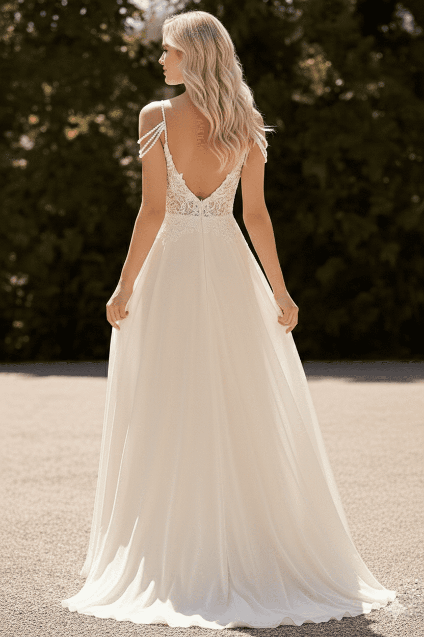 Las tiras colgantes añaden un movimiento único y romántico, mientras que la falda de corte en «A» fluida le otorga una caída espectacular. Esta falda incluye una abertura lateral diseñada para que se sienta como toda una diosa, combinando comodidad y sensualidad. Es un vestido de novia bohemio creado para robar miradas y capturar la esencia de un amor auténtico.
