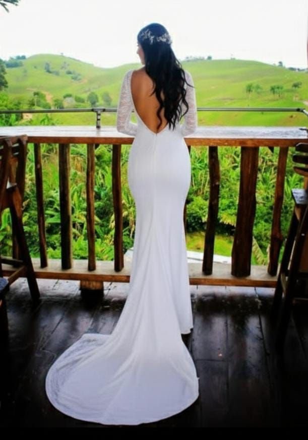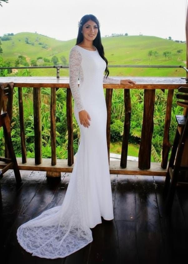 No pierdas la oportunidad de lucir radiante y deslumbrar a todos en tu boda con este hermoso vestido de novia sirena con manga larga. ¡Reserva tu cita en nuestra tienda y déjanos ayudarte a encontrar el vestido de tus sueños!