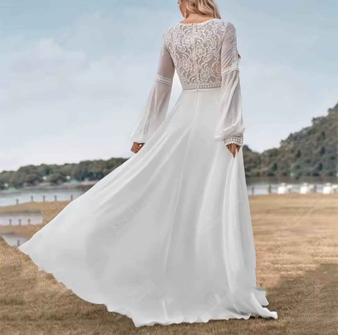 ¿Buscas un vestido para novia que combine elegancia y comodidad? ¡Tu búsqueda ha terminado! Este vestido para novia elegante destaca con su escote en V y mangas transparentes que terminan en unos puños a juego con el top. La fusión perfecta de glamour y confort para que puedas moverte libremente en tu gran día.